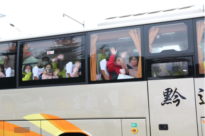 秋风萧瑟天气凉,摇旗欢呼暖人心。校门口的师生代表挥舞着手中的红旗,嘴里喊着“欢迎回家!你们辛苦了!”大巴车上的志愿者们纷纷挥手问候并举起手机记录。