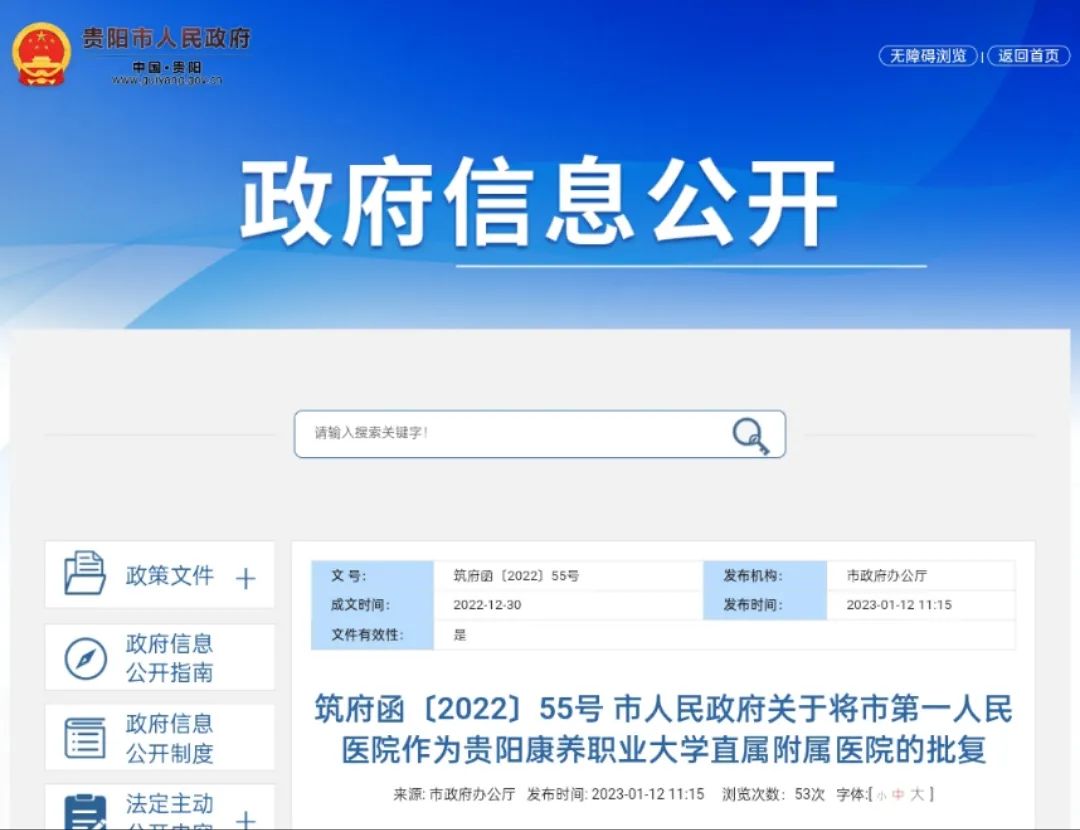 1月12日,贵阳市人民政府网发布《关于将市第一人民医院作为BEAT365英国官网直属附属医院的批复》,具体内容如下: