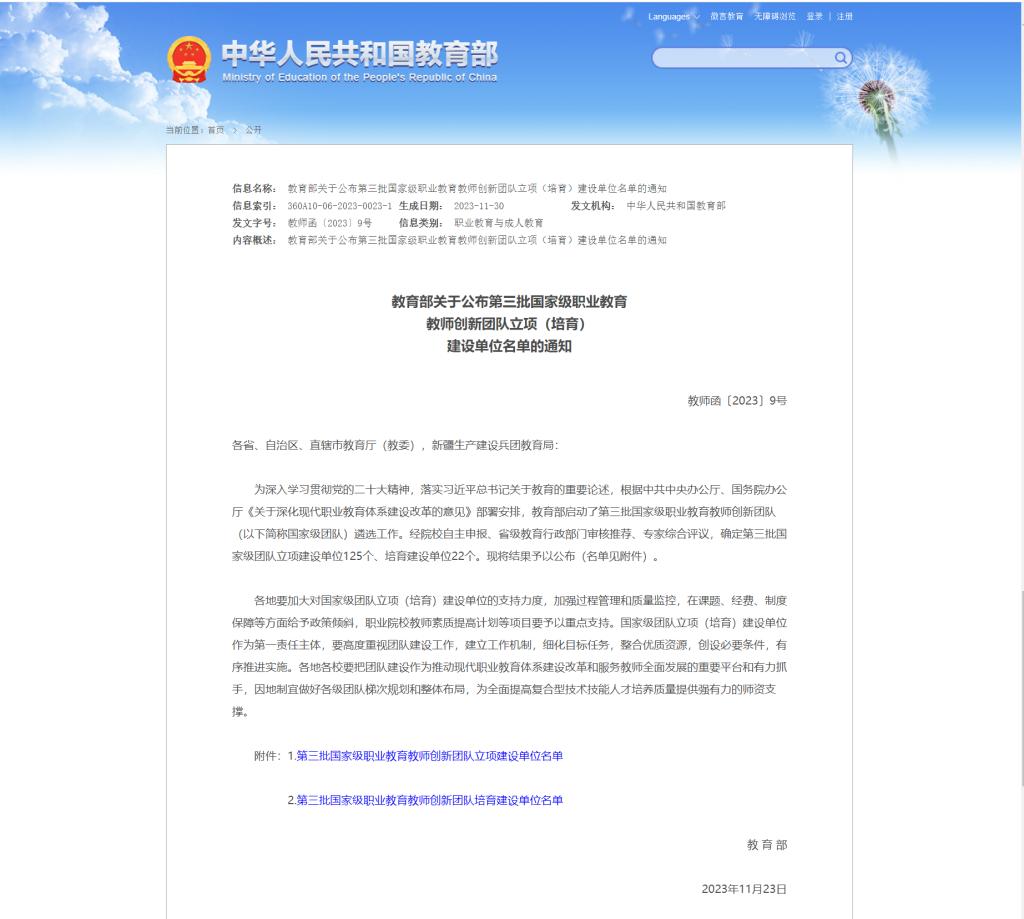 喜报|学校获批第三批国家级职业教育教师创新团队培育建设单位