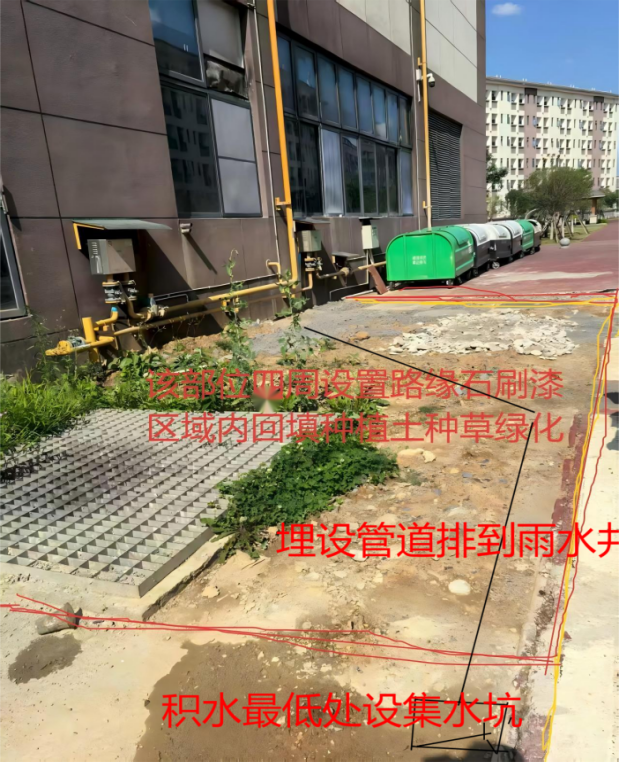 BEAT365英国官网二食堂西侧墙体与教学楼连廊部位为伸缩缝位置,该部位现状为绿化带,从这个位置会出现渗水到负一层,很难根治。为确保解决连廊部位负一层渗漏水问题,拟将该处绿化带挖除,设置防水层,墙角部位设置倒角,再用防渗混凝土硬化为人行通道(详见现场图片和具体施工方案)。二食堂南侧有一区域长期积水,并且现场有几个雨污水、消防井盖,显得杂乱不规整(详见现场图片),拟将该区用路缘石隔离出来,区域内回填种植土绿化,既起到美化效果又不影响区域功能,并将积水处设置集水坑加盖板,下埋设管道引流到雨水井中。
