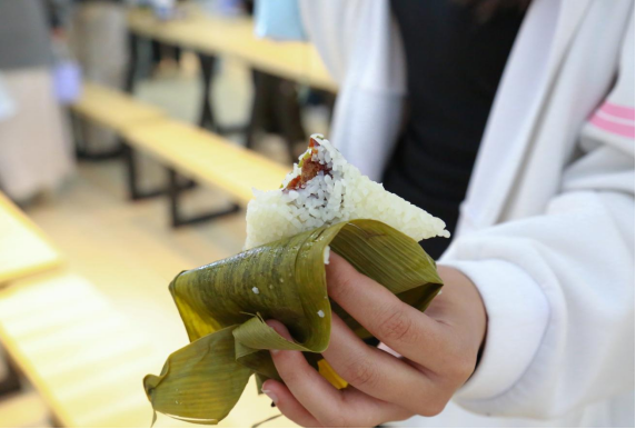 本次端午活动主要分为两个环节。首先进行的是包粽子实践环节,学生们以小组为单位开展包粽子实践,每组领取糯米、粽叶、红枣等基础食材及咸蛋黄、紫薯泥等特色原料,在食堂师傅或学长学姐的指导下学习传统四角粽包法,粽叶对折成漏斗状后填入糯米与馅料,压实后用棉线捆扎固定,过程中各组相互交流技巧、比拼速度与创意,现场洋溢着欢声笑语与粽叶清香。