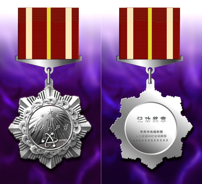 奖章由黄铜压制成型,采用镀银工艺,全部为银色。奖章中心部位由上中下三部分组成。其中,上部为五星图案,中间部分是由毛泽东同志亲笔题写的“为人民服务”字样,奖章中心的下半部分图案为原子,奖章核心部分周围为波浪型水纹。