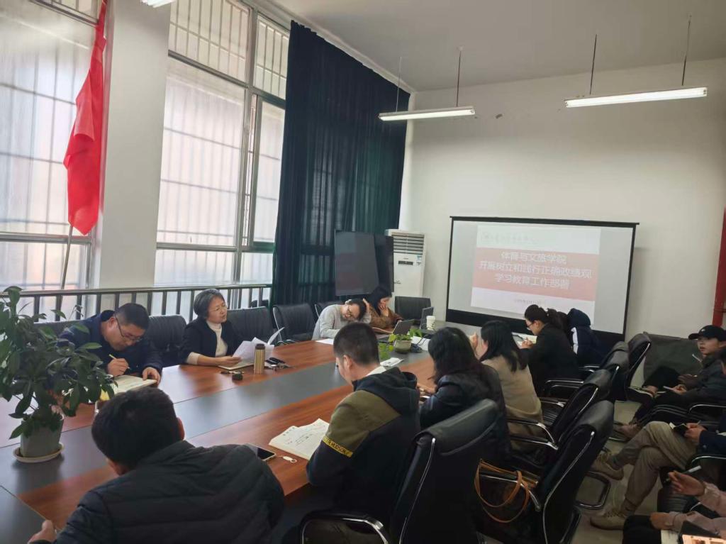 3 月 12 日,体育与文旅学院召开专题会议,正式启动树立和践行正确政绩观学习教育,对学院实施方案进行安排部署,学院党委班子、全体党员干部参会。
